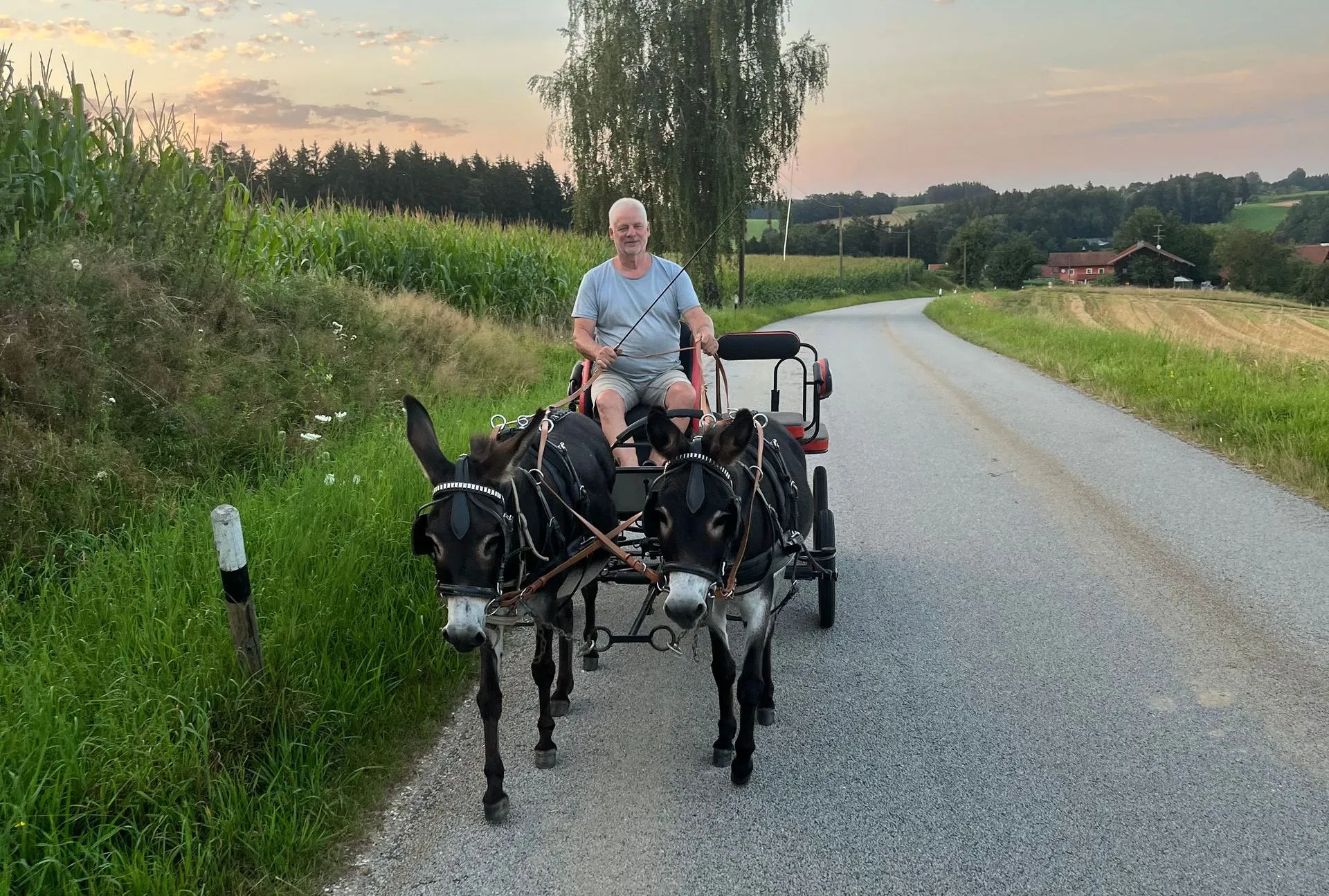 Un paseo en carruaje tirado por burros es pura relajación, sobre todo aquí, en Erlbach, en el Holzland bávaro, cerca de Altötting. Junto a nuestros dos burros Lola y Sancho, viajarás a un ritmo pausado por el campo, lejos del estrés de la vida cotidiana y muy cerca de la naturaleza.
